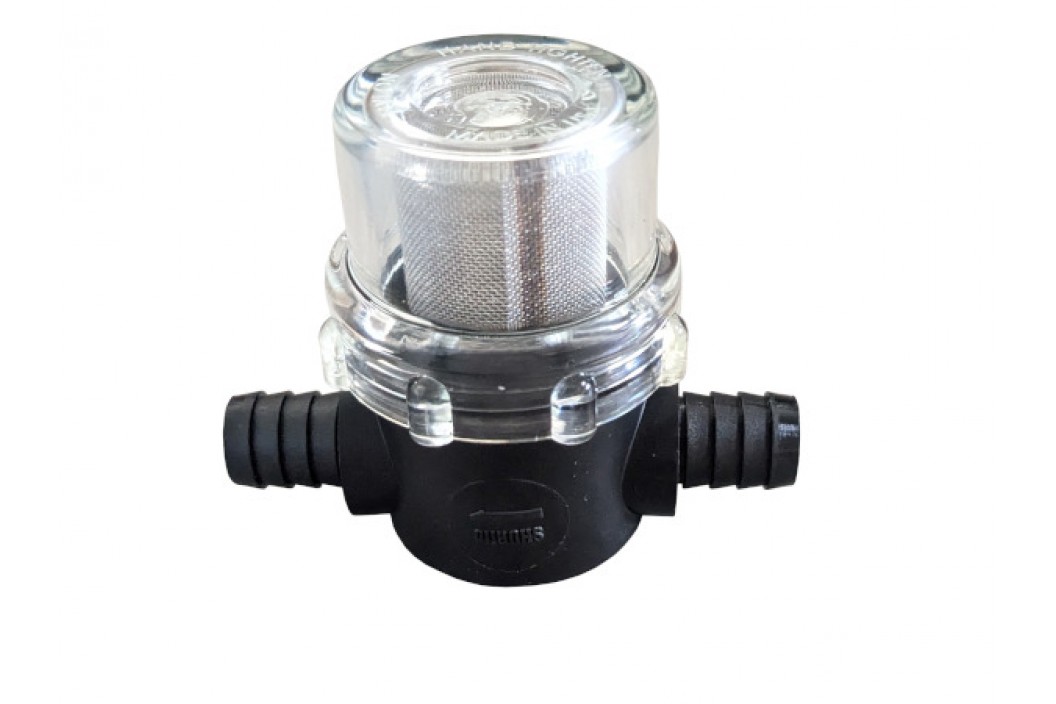 Filtre antidébris de la marque Shurflo® avec une entrée/sortie cannelées de diamètre 13 mm. Il est possible d'y emmancher un tuyau de diamètre 10 mm en le chauffant quelques secondes dans de l'eau chaude.