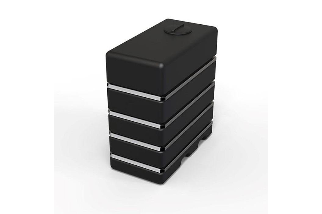 C’est le plus gros réservoir plastique rectangulaire existant. Il a un excellent rapport encombrement / litrage car il ne comporte pas de puits de rigidification. En revanche, il inclut un cerclage métallique qui lui évite de prendre du ventre du fait de la pression statique de l’eau.